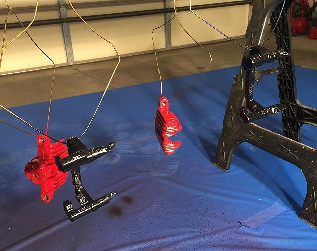 On the lift at my mechanic's garage. Getting rear brake lines replaced and having him throw on my extra set of calipers and brackets that I painted and my drilled and slotted rotors while he's at it.