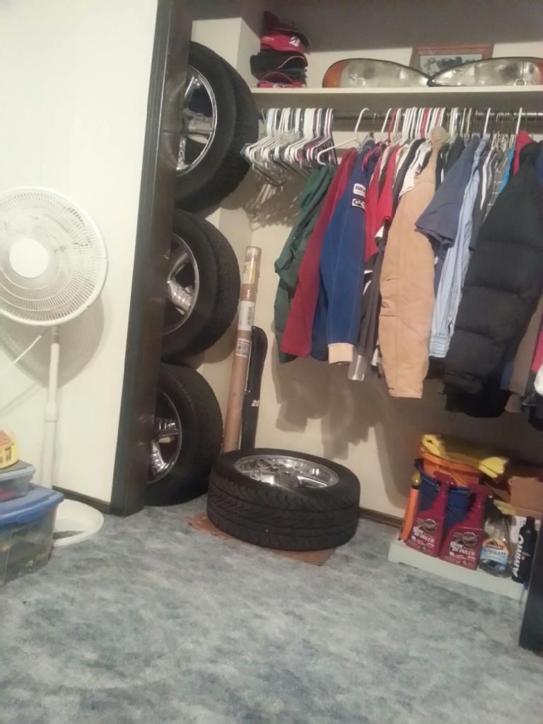 . Car is still beading like a champ, no need for windshield wipers. I've come to the conclusion moderate dealership paint jobs all have orange peel, I've seen 2012 cars that have it and they're barely old. So what I want to think in my mind I will continue to think, that is it just the texture of a run-of-the-mill factory paint job . Not that its bothering me but my car may appear to have it but the paint is still completely smooth to the touch. Anyways, I cleaned the fk outta my room and now my closet can be useful. Removed the closet doors and found a place to store my wheels for the winter ![]() ![]()