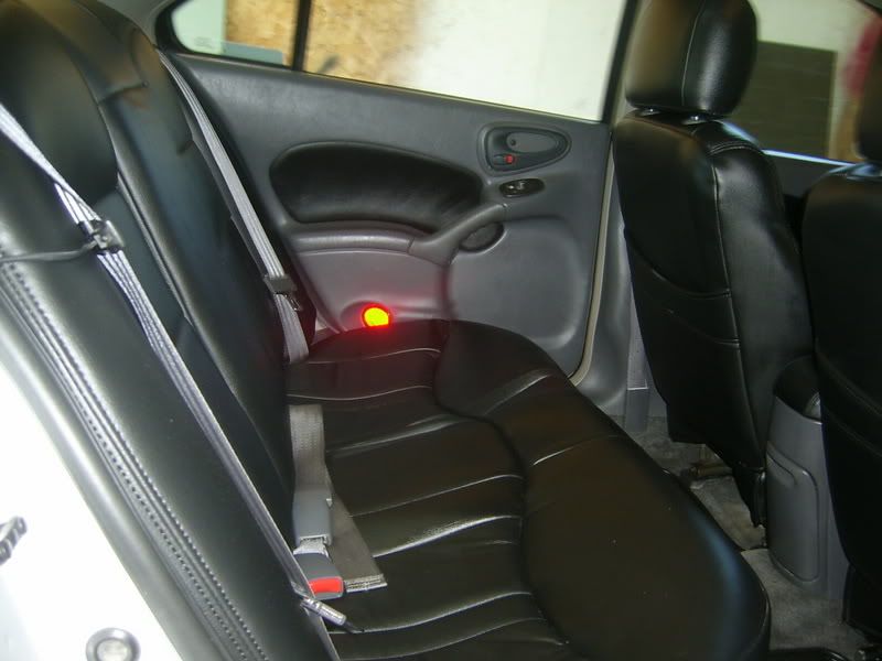 Also shown are the KATZINS leather Interior pieces with Door panel inserts . I also have the leather shift booth and arm rest cover , thanks to redline goods , I really like those pieces , along with a leather automatic MOMO shifter . I have the mustang gas cap ( with the mustang logo removed of couse) and painted it to match the car . I think it looks pretty sharp with the metal stubby antenna . In the trunk it shows my nitrous tank and subs ( 12 inch directed subs ) . I also switched my exhaust from a dual setup to a single flowmaster setup with Magnaflow tips . I also put on the black headlights for now until I recieve my "other" set of lights (hopefully this year) . here are some shots of the wheels (sorry for the crappy pictures I can't use a digital camera . . )![]() ![]() ![]() Up close (showing the Baer claw brakes): ![]() the trunk setup : ![]() interior pictures: ![]() ![]() ![]() ![]()